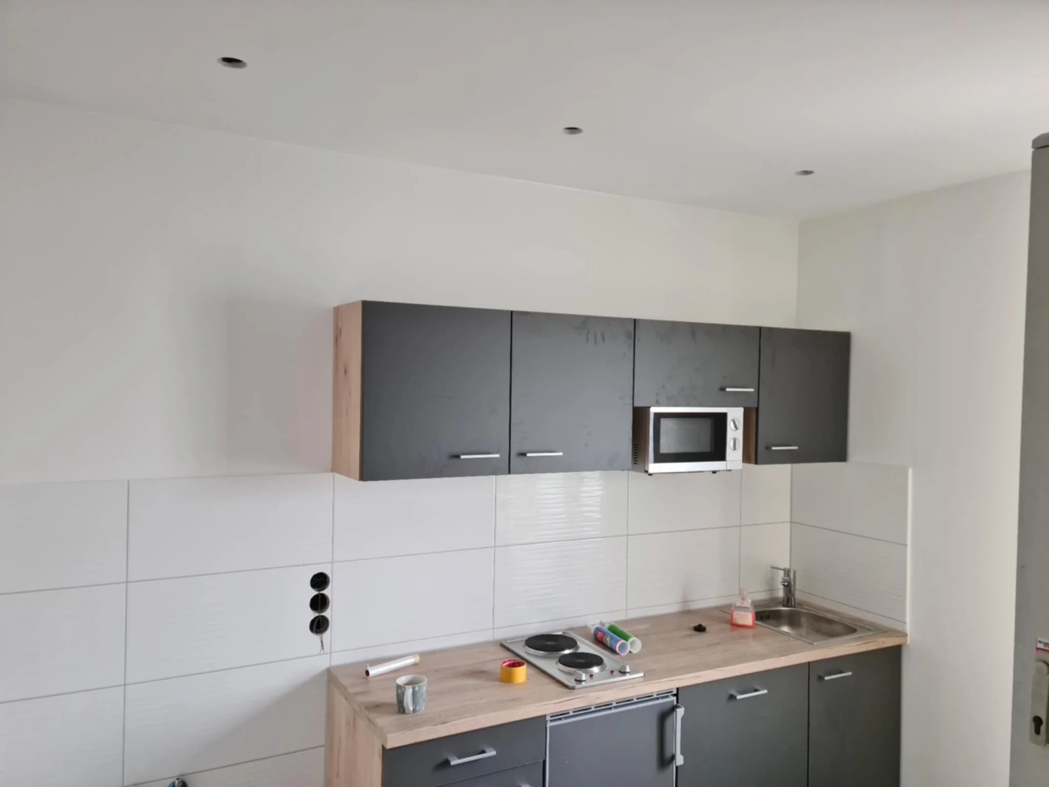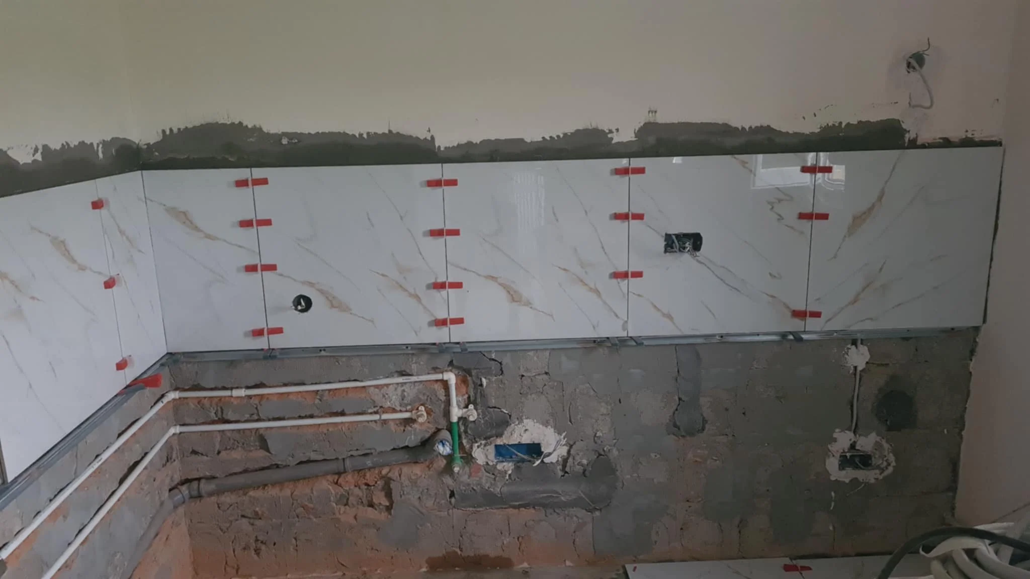 – Postavljanje keramičkih pločica na zidove između donjih i gornjih elemenata (tzv. kuhinjski panel),